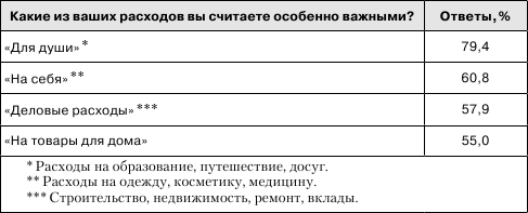 Эти мотивы обусловливают траты «для души» – на досуг (шопинг, выбор варианта, дизайна), траты «на себя», т. е. на здоровье (улучшение экологии жилища), и деловые траты – на строительство и недвижимость.