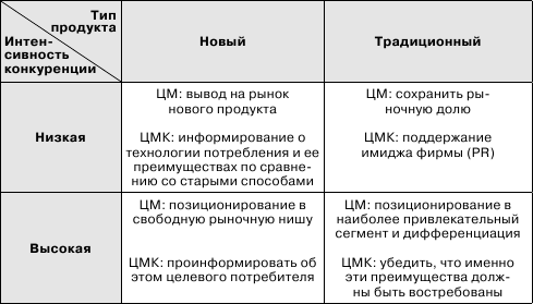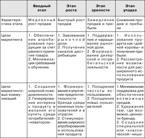 Оксана Юлдашева сосредоточивает внимание на соотношении целей в случаях разного сочетания интенсивности конкуренции на рынке и типа продукта (см. табл. 1.5).[95] Ее английские коллеги показывают соотношение целей для разных жизненных этапов товара на рынке (табл. 1.6).
