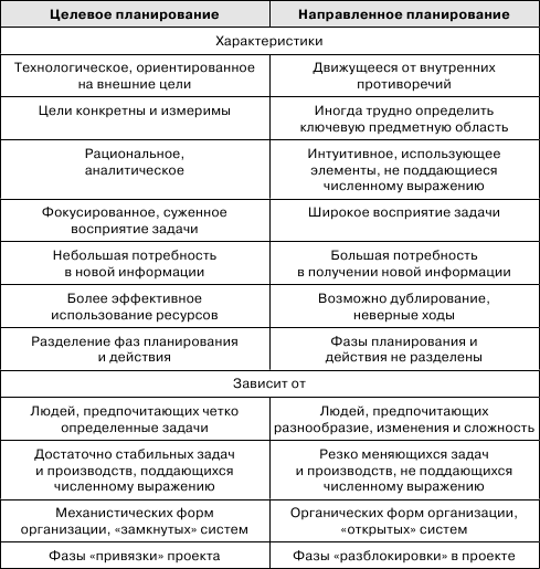 По Ю. Кузнецову, суть направленного планирования заключается в том, чтобы двигаться сначала в определенную исследуемую область, т. е. в определенном направлении, а затем, с появлением большей ясности в ситуации, суживать цели.[105] Ниже (табл. 1.7) изложены характеристики целевого планирования (замкнутого) и направленного планирования (не имеющего фиксированного окончания).
