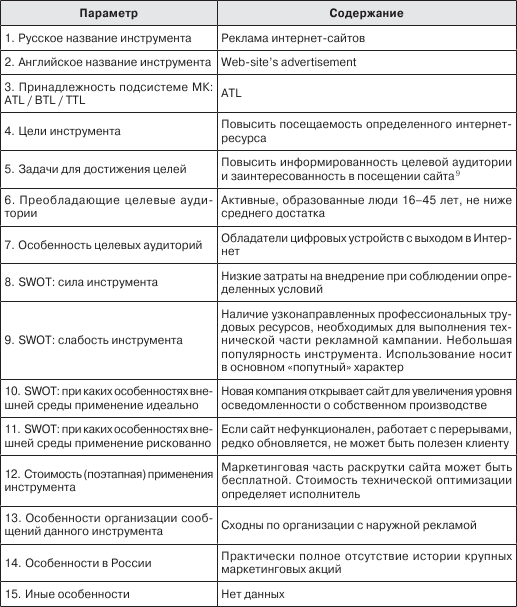 Сведем данные по инструменту «веб-сайт» в табл. 2.1.