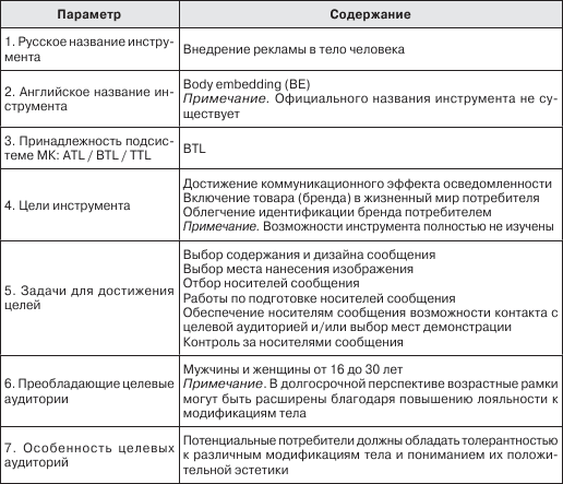 В системе маркетинговых коммуникаций, рассчитанных на интегративное воздействие на целевые группы, BE выступает в роли технологии, обеспечивающей донесение идей до потребителя, информирующей о продукте. Это один из лучших способов привлечь внимание, заинтересовать потенциального покупателя на стадии вывода товара на рынок. Используя инструмент в сочетании с другими коммуникативными элементами, можно достичь полноценного внедрения своеобразного «метасообщения», складывающегося из отдельных сообщений, в жизненный мир целевых аудиторий, сделать фирменную татуировку трендом сезона.