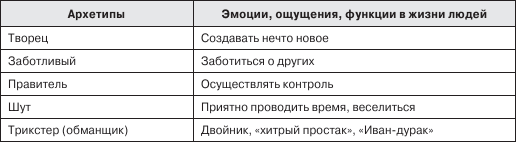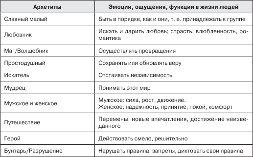 Существует огромное количество архетипов, но главных, основополагающих выделяют не так много, обычно не более 30. М. Марк и К. Пирсон в своей книге «Герой и бунтарь»[69] рассматривают 12 основных архетипов (табл. 7.1).