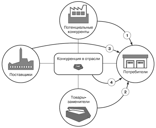 Существует несколько подходов, классифицирующих основные типы конкуренции в отрасли. Ф. Котлер выделяет четыре направления конкуренции: конкуренция торговых марок, отраслевая конкуренция, формальная конкуренция и общая конкуренция. Ю. Рубин указывает, что существует продуктовая, межпродуктовая, отраслевая и межотраслевая конкуренция[5]. М. Портер предложил модель «пять сил конкуренции» для оценки конкуренции в отрасли.