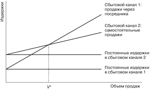 В случае небольших объемов продаж производителю невыгодно организовывать собственное торговое подразделение, потому что продажи не оправдают издержек на организацию продаж. Однако по достижении некоторого объема продаж V* организация собственной системы продаж становится более выгодной, так как издержки на работу с посредниками становятся выше. Поэтому по достижении некоторого объема продаж компании-производители стремятся работать с клиентами напрямую, без посредников.
