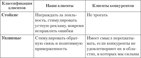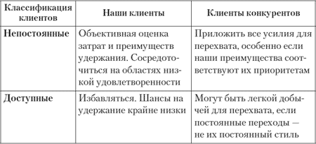 Перечисленные методы сегментирования позволяют выделить группы клиентов, которые (пока!) работают с конкурентами и которые наиболее чувствительны к действиям компании по перехвату. То есть если попробовать на основании предложенных классификаций нарисовать портрет клиента конкурента, наиболее перспективного для перехвата, то он выглядел бы следующим образом: высокая прибыльность, легкая переключаемость, низкая удовлетворенность, ищет те выгоды, которые может предложить компания. Конечно, такого идеального для перехвата клиента найти сложно, однако чем в большей степени клиенты конкурента обладают вышеперечисленными характеристиками, тем в большей степени активность в отношении их перехвата может быть вознаграждена.
