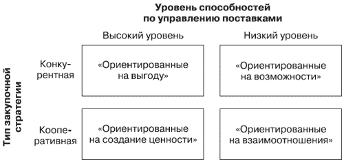 Компании, ориентированные на выгоду. Данные компании осуществляют закупки у нескольких поставщиков (портфель поставщиков) и стараются получить выгоду за счет снижения шансов оказаться в зависимости от одного поставщика. Эти фирмы постоянно ищут и активно вовлекают новых поставщиков во взаимодействие. При принятии решений по закупкам ориентированные на выгоду компании во главу угла ставят качество.
