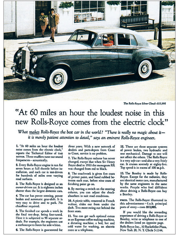 Прежде чем я это написал – наиболее известную из всех реклам автомобилей, – я сделал домашнее задание. Реклама вышла только в двух журналах и двух газетах и обошлась «на круг» в 25 тысяч долларов. В следующем году «Форд» целиком основал свою многомиллионную рекламную кампанию на утверждении, что их машины еще тише, чем «Роллс-Ройс».