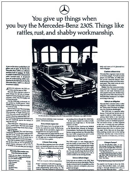 Я отказался от сотрудничества с «Роллс-Ройсом» после того, как они ввезли в США пять сотен бракованных машин. Два года спустя нашим клиентом стал «Мерседес», и мы послали целую команду наших сотрудников на завод в Штутгарте. Затем последовала построенная на конкретных фактах рекламная кампания, которая подняла уровень продаж этих машин в Соединенных Штатах с 10 тысяч в год до 40 тысяч.