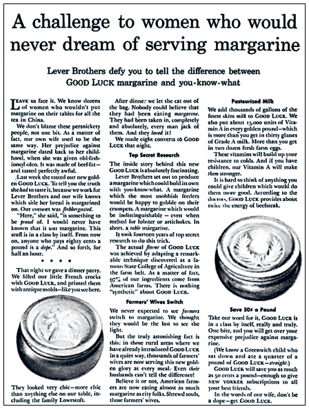 Когда меня попросили создать рекламу для маргарина «Гуд Лак», я, подобно многим, считал, что маргарин на самом деле изготовляют из нефти. Однако десять дней внимательного изучения технологии производства – и я написал опять-таки основанный на фактах рекламный текст, оказавшийся весьма успешным.