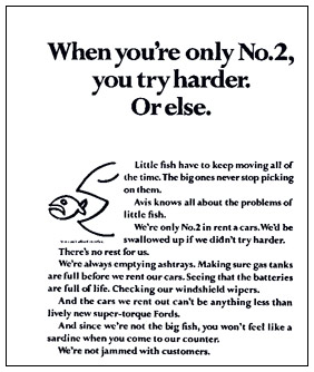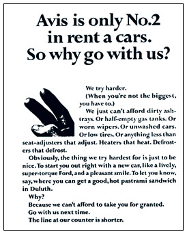Роберт Таунсенд, эксцентричный руководитель агентства по прокату автомобилей «Авис», попросил меня написать эту рекламу. Но после того как конфликт с другим клиентом вынудил меня отклонить это предложение, Дойл Дейн Бернбах создал одну из наиболее мощных рекламных кампаний за всю историю рекламного мира. «Когда ты лишь второй, ты всегда стараешься больше. Или просто делаешь все по-другому». Этот дьявольский ход превратил в ад жизнь компании «Хертц», которая занимала первое место.