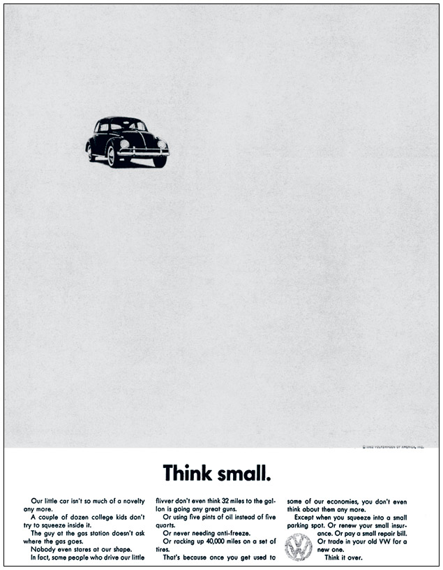 Бернбах позиционировал «Фольксваген» как протест против машин из Детройта, возведя таким образом «жука» в культ среди прослойки нонконформистской молодежи. Продажи резко подскочили до 500 тысяч машин в год.