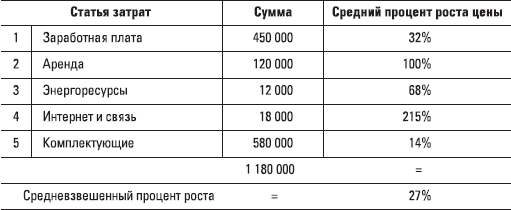 Стоит еще учесть изменение цен на рынке. Если ваши цены в среднем выросли на больший процент, чем объем продаж, – на самом деле объем продаж упал. Посчитайте также индекс входящих цен (он обычно выше официального процента инфляции), т. е. высчитайте средневзвешенный процент роста цен на входящие ресурсы. В табл. 0.2 мы видим упрощенный пример, в котором средневзвешенный процент роста входящих цен составил 27 %. Если объем продаж компании в денежных единицах вырос менее чем на 27 %, следовательно, продажи компании становятся менее рентабельными (т. е. прибыль падает). Если в действительности прибыль не упала, значит, были предприняты дополнительные усилия по экономии ресурсов. Можно также сравнивать темпы роста объемов продаж и роста себестоимости; естественно, темпы роста объемов продаж должны быть выше.