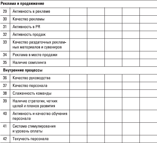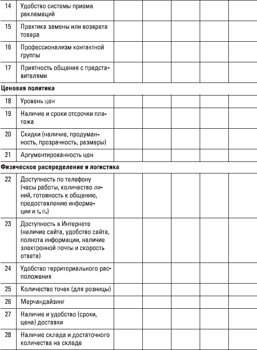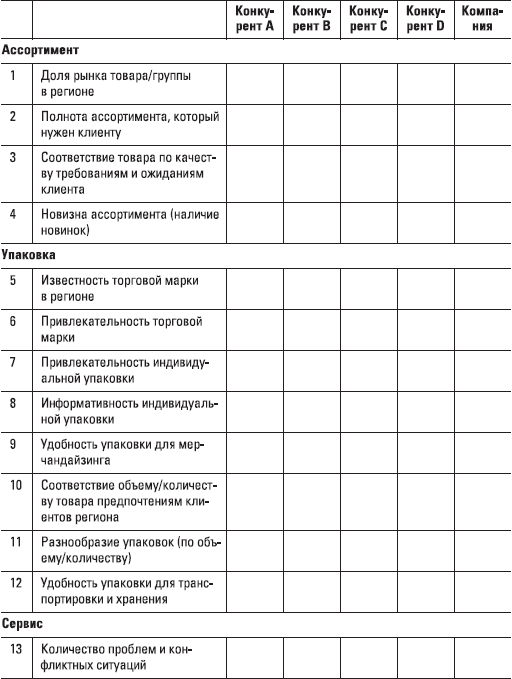 Пожалуйста, оцените вашу компанию и каждого конкурента, выставив баллы для той или иной позиции исходя из 10-балльной шкалы («1» – минимально возможный уровень, «10» – максимально возможный уровень, при котором дальнейшие улучшения невозможны). Если у вас нет информации о конкуренте по одному из показателей, поставьте в клеточке другим цветом (чтобы в ближайшее время добыть информацию и заменить цифру) «5» – среднее значение.