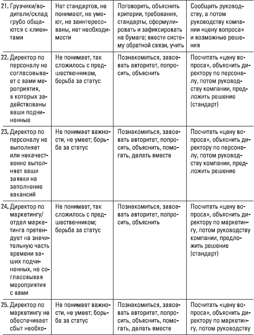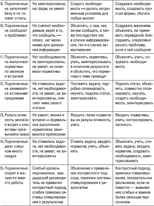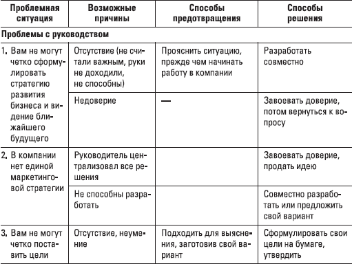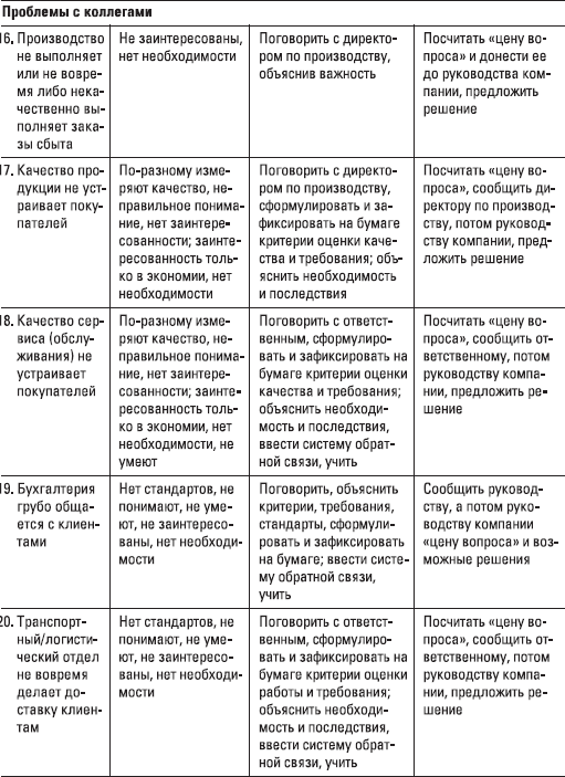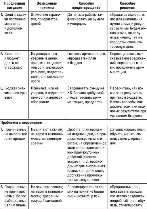 Посмотрите (табл. 1.5) на некоторые проблемы, с которыми вы можете столкнуться на позиции директора по сбыту, а также рекомендации по предотвращению и решению этих проблем в табл. 1.4. Более подробно с описанием части проблем и решений вы будете иметь дело в последующих главах.