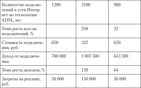 Компания-провайдер провела акцию в октябре с предоставлением скидки на подключение по технологии ADSL в размере 50 %. Акция сопровождалась активными рекламными мероприятиями. Рекламный бюджет на акцию превысил среднемесячный в 3 раза.