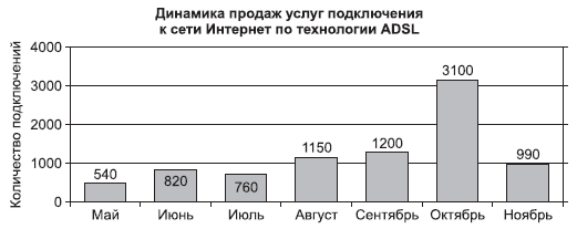 Полученные данные по объемам продаж свидетельствуют, что количество подключений к сети Интернет по технологии ADSL в период проведения активных маркетинговых мероприятий составило 258 % по отношению к показателю прошлого месяца.