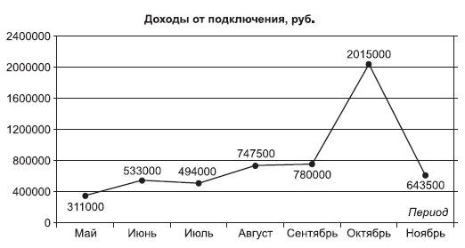 Процент изменения доходов составил 129 %, т. е. доходы увеличились не так значительно по сравнению с объемом продаж за счет предоставленной скидки на подключение. И все же рост доходов обеспечен большим приростом подключенных клиентов. То, что рост объемов продаж и доходов обеспечен именно маркетинговыми мероприятиями, а не, например, деловой активностью, свидетельствуют показатели послерекламного периода (ноября). Как и следовало ожидать, послерекламный период – сезон затишья и некоторого ожидания потребителями новой акции.