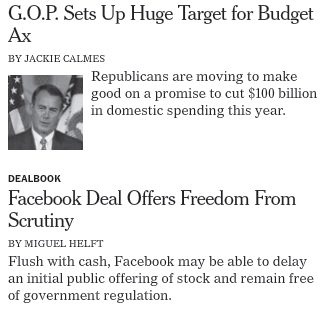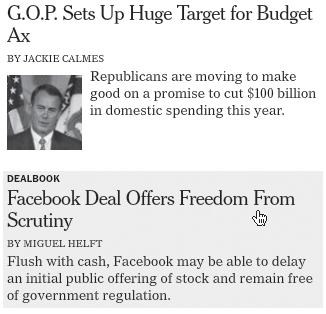 В наше время стал уже привычным следующий побудительный сигнал: синий подчеркнутый текст означает гиперссылку, и если щелкнуть на нем, то окажешься на другой странице. Однако в последнее время гиперссылки утратили свою характерную особенность, и единственным побудительным сигналом является подсветка, возникающая при наведении курсора. На рис. 7.7 и 7.8 представлена страница New York Times Reader до и после того, как на нее навели курсор. Чтобы заметить этот сигнал, потребуется дополнительное внимание. Если вы просматриваете страничку на своем iPad, все эти сигналы останутся незамеченными из-за использования технологии мультитач. Как только вы коснетесь пальцем экрана, вы перейдете по ссылке.