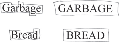 Вы, возможно, слышали о том, что слова, состоящие из одних прописных букв, читать труднее, чем слова со смешанным составом букв (прописные и строчные) или слова, состоящие только из строчных букв. Кроме того, вы, возможно, даже слышали о неких исследованиях британских ученых, показавших, что «разница в трудности их восприятия составляет от 14 до 20 %». Это объяснялось тем, что при чтении мы узнаем формы слов и групп слов. Слова со смешанным составом или слова, состоящие только из строчных букв, имеют однозначно идентифицируемую форму. А все слова, состоящие только из заглавных букв, имеют одинаковую форму – прямоугольник определенного размера – поэтому, теоретически, их труднее различать (рис. 13.1).
