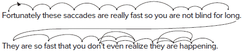 При чтении кажется, что наш взгляд непрерывно перемещается по строчкам на странице, но на самом деле наши глаза движутся быстрыми скачками с короткими паузами между ними. Скачки называют саккадами (за один прыжок считывается от 7 до 9 букв), а паузы между ними называются фиксациями (продолжительность их около 250 миллисекунд). Во время саккады мы ничего не видим, то есть фактически слепы, но саккада происходит настолько быстро, что мы не успеваем это осознать. Большую часть времени взгляд не меняет направление, но на краткий промежуток времени (10–15 %) взгляд возвращается назад, чтобы перечитать буквы или слова.