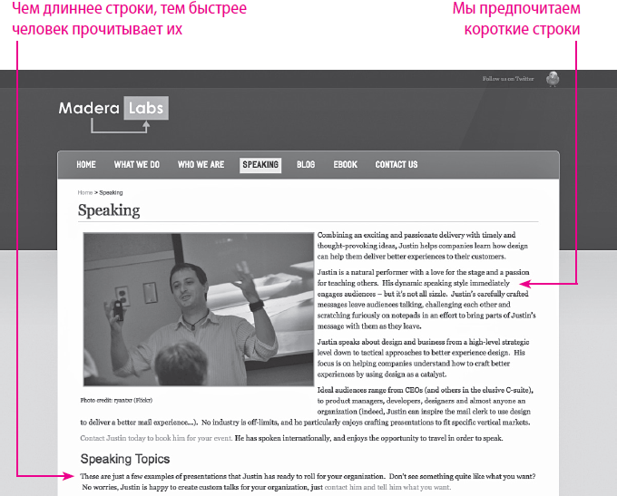 Если вы проведете опрос с целью узнать, что предпочитают люди, то получите ответ – множество колонок с короткими строчками. Ну а если вы спросите, что они читают быстрее, они будут настаивать, что также множество колонок с короткими строчками, хотя данные экспериментов показывают обратное.