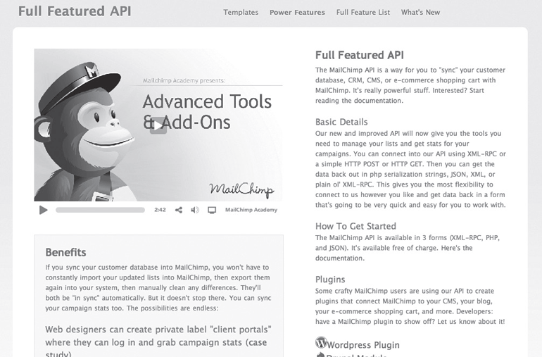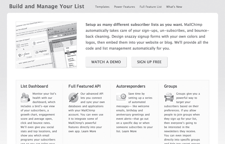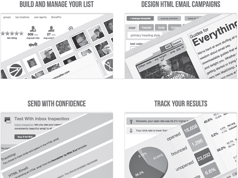 На рисунках, приведенных ниже, показан пример постепенного раскрытия (www.mailchimp.com. сервис MailChimp). Вместо того чтобы на первой странице дать полное описание всех услуг, предоставляемых данным сайтом, посетителю предлагается только список видов деятельности с соответствующим изображением для каждого пункта (рис. 27.1). Любой из пунктов можно раскрыть и получить необходимую дополнительную информацию (рис. 27.2). Затем пользователь может отправиться на следующий уровень раскрытия для того, чтобы получить еще больше информации (рис. 27.3). Предлагая пользователям небольшие порции информации, вы не «перекармливаете» их, но в то же время откликаетесь на запросы различных людей – некоторым достаточно общего обзора, тогда как другие хотят вникнуть в детали.