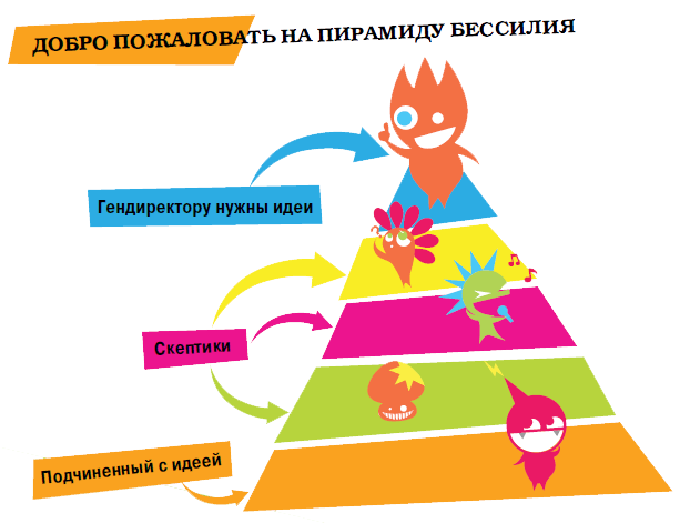 Идея, выдвинутая кем-то из починенных, находящихся ближе к началу «пищевой цепочки», может и не пробиться наверх: слишком уж много уровней ее создателю необходимо пройти, чтобы добраться до босса. На каждом уровне есть люди, которые могут сказать «нет», и в результате идея гибнет раньше, чем доберется до человека, принимающего решение. Как сказал Чарльз Кеттеринг, автор многих полезных изобретений, в том числе и стартера: «Если бы кругом были одни скептики, никто, никогда и ничего бы не изобрел».