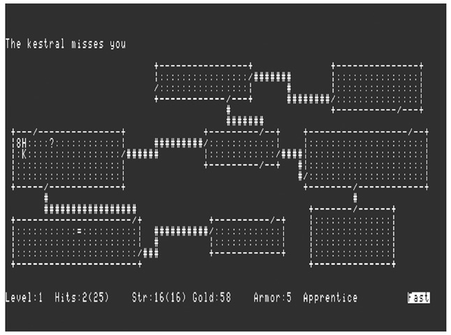 Вот скриншот компьютерной игры Rogue (1980). Поход по подземельям. Противники обозначались буквами: С – кентавр, Z – зомби и т. д. Простор для воображения игрока был максимальным. Не то что в современных компьютерных играх.