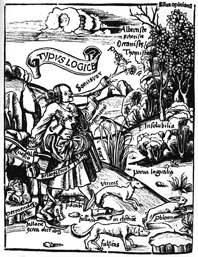 Грегор Рейш. Margarita Philosophica, 1503. Две собаки Veritas (лат. «истина») и Falsitas (лат. «ложь») преследуют зайца Problema (лат. «задача»), логика, вооруженная мечом силлогизма, спешит позади