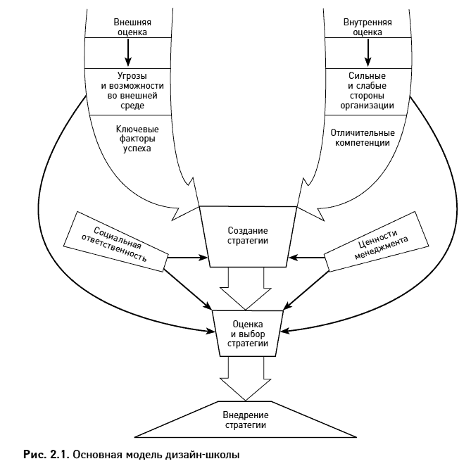 Наше описание основной модели школы дизайна (повторяющее описание К. Эндрюса (187), но с некоторыми дополнительными элементами) представлено на рис. 2.1. Судя по тому, какое внимание уделено этому в тексте К. Эндрюса, автор делает основной акцент на оценку внешних и внутренних ситуаций. К первым относятся существующие во внешнем окружении угрозы и возможности, ко вторым – сильные и слабые стороны организации. (На каждой из этих категорий К. Эндрюс останавливается не слишком подробно, да и сам его текст занимает в издании 1982 г. всего 114 страниц, тогда как остальные 724 посвящены анализу конкретных примеров.) Что касается внешней оценки, то помимо 12-страничной вставки из работы М. Портера (Porter, 1980, принадлежащей к школе позиционирования), в этом издании восемь страниц посвящено технологическим, экономическим, социальным и политическим аспектам внешней среды компании и кратко обсуждаются проблемы прогнозирования, поиска и анализа данных. К. Эндрюс завершает свои рассуждения вопросами «Какова основная структура отрасли, в которой действует фирма?» и «В чем состоит влияние прогнозируемых изменений социального, политического и макроэкономического контекстов на отрасль или фирму?».