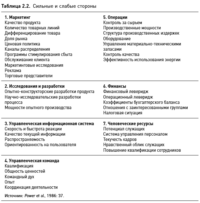 Несмотря на то что, как мы увидим, стратегический менеджмент как наука включает в себя несколько направлений, в большинстве стандартных учебников в качестве отправной используется модель SWOT. В табл. 2.1 и 2.2 представлены основные принципы внутреннего и внешнего подходов в том виде, в каком они предложены в одном из подобных пособий. Аналогично, несмотря на ту оценку, которую они дают новым методам, многие консультанты по стратегическому процессу опять-таки продолжают опираться на модель SWOT и другие понятия школы дизайна. Когда в 1980-х гг. голоса сторонников школы планирования немного поутихли, теоретики и практики вновь «заговорили» на языке дизайн-школы. Например, использовавшийся консультационной фирмой Kepner-Tregoe термин «закон экономии» есть почти прямая цитата из книги К. Эндрюса: «…следуйте стратегиям ясным, простым и конкретным» (Tregoe and Tobia, 1990: 16–17).