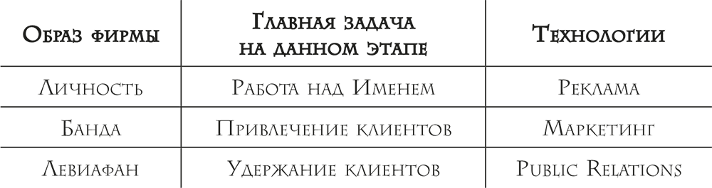 Итак, мы кратко определили образы фирмы, которые соответствуют ее развитию на определенных этапах. У каждого из этих образов – личности, банды и левиафана – есть один-единственный направляющий принцип, на который нужно ориентироваться при подборе частных технологий раскрутки. Наборов инструментов всего три: PR, маркетинг и реклама. Для фирмы конкретного образа – свой набор методик.
