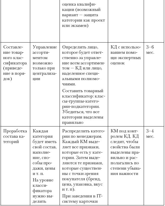 ? введение специальной должности – категорийный менеджер и разработку нормативных документов, регулирующих деятельность категорийных менеджеров: а) должностной инструкции; б) положения о подборе, обучении, мотивации и оценке; в) требований к квалификации. По необходимости – пересмотр штата категорийных менеджеров, проведение аттестации и подбор и обучение новых сотрудников (о новой должности – категорийный менеджер – мы будем говорить в этой главе);