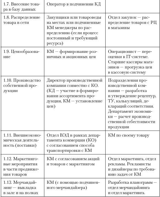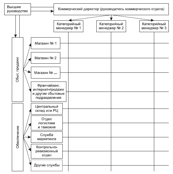 Для повышения эффективности работы в компаниях с большим ассортиментом и развитой филиальной сетью в подчинении категорийного менеджера находятся менеджеры по закупкам (то есть специалисты, которые осуществляют тактическую ежедневную работу по заказу и оформлению товаров), иногда мерчандайзеры (возможно, они могут находиться в двойном подчинении: административно подчиняясь директору магазина, если стандарт должности требует его присутствия в магазине), реже – маркетологи (специалисты, отвечающие за тактические мероприятия по рекламе и маркетингу по конкретным категориям). Безусловное двойное подчинение является тонким моментом в любой организации. Но если оно прописано как стандарт работы и сотрудник в двойном подчинении знает, в каких случаях он обращается непосредственно к директору магазина, а в каких – к категорийному менеджеру, то минусы от такой структуры незначительны: требуется более частое согласование действий, что при наличии современных средств связи не будет препятствием для работы.