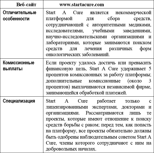 Start A Cure начал работать в марте 2013 года и стал известен благодаря уникальному подходу к краудфандингу как к источнику финансирования онкологических исследований. Эта платформа позволяет спонсорам поддерживать конкретных ученых и исследовательские проекты, концентрирующиеся на изыскании средств борьбы со специфическими формами рака. Таким образом, спонсоры имеют возможность совершения целевых пожертвований, которые направляются на исследования определенных форм болезни, вызывающих у них эмоциональный отклик.