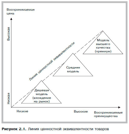 Часто потребители утверждают, что самый важный критерий – это низкая цена. Данный миф поддерживается исследованиями, в ходе которых потребители, отвечая на вопрос о приемлемом уровне реальных цен, естественно, выбирают более низкие цены. Однако, по мнению некоторых психологов, они так поступают, надеясь подтолкнуть цены вниз. При принятии конкретных решений о покупке важность низкой цены нередко преувеличивается. В действительности эмоциональная составляющая во многих случаях играет более существенную роль, чем это принято предполагать. Потребители, рассуждая о низких ценах, на самом деле стремятся получить товар, обладающий некоторой ценностью. Высокая цена допустима, когда товар обеспечивает покупателю большие выгоды. Низкая цена часто отражает и низкие потребительские свойства товара. Данную зависимость можно представить в виде графика. Для начала определим критерии оценки преимуществ товара. Например, это может быть выходная мощность электромотора, цена повторной продажи автомобиля после трех лет эксплуатации, вкусовые качества маргарина или показатель, учитывающий различные качества. Горизонтальная ось на графике отображает преимущества товара. На вертикальной оси фиксируется цена товара. Расположив на графике товары с соответствующими преимуществами и ценами, получим так называемую линию ценностной эквивалентности (см. рис. 2.1). Чем выше находится на этой линии товар, тем больше у него преимуществ и выше цена.