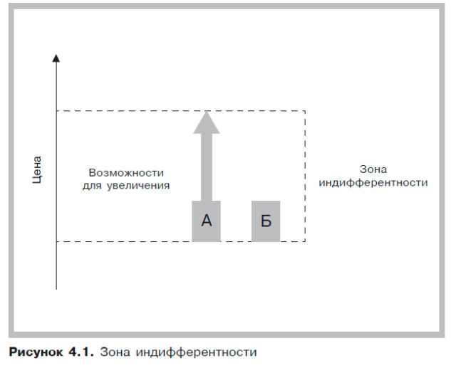 На рисунке 4.1 представлены два товара, имеющие приблизительно одинаковую цену. Зная, где находится интервал индифферентности цены для потребителей на этом рынке, можно увеличить цену для продукта А до верхней границы зоны и придать ему большую ценность без какого бы то ни было снижения объема продаж продукта В. Однако повышение цены выше уровня, обозначенного пунктирной линией, запустит в действие обычный механизм перекрестной эластичности.