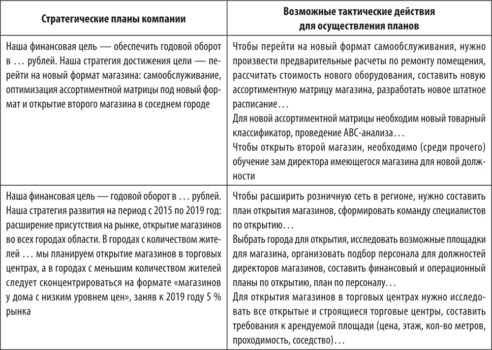 Тактика – это заранее разработанная последовательность действий для выполнения стратегических планов. Это тоже планы, но более детализированные, направленные на осуществление какой-либо части общей программы. Пример представлен в табл 1. 10.