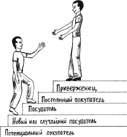 Вернемся на два шага назад, а именно – к той части книги, где речь шла о покупательской лояльности. Мы говорили о том, что можно выделить пять групп покупателей, они же стадии лояльности Когда покупатель переходит из группы в группу, т. е. от стадии к стадии, можно сказать, что он покупает сегодня больше, чем вчера, а завтра будет покупать больше, чем сегодня. Не к этому ли стремится каждый руководитель магазина?