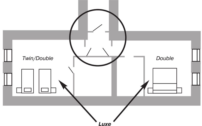 Из рисунка видно, что из коридора гость попадает в тамбур, из которого можно войти в два номера. Если отель сдает два номера по отдельности, то дверь в тамбур постоянно открыта и постояльцы получают карточки-ключи от каждого номера. При этом один из номеров может быть как Twin (с раздельными кроватями), так и Double (с единой кроватью). Другой номер оснащен специализированным диваном, который в раздвинутом виде ничем не отличается от двуспальной кровати, т. е. этот номер может быть только Double. При продаже номеров как единого номера люкс в номере Double диван складывается – и эта комната превращается в холл люкса. Второй номер становится спальней. Дверь в тамбур закрывается и становится входной дверью в номер люкс с холлом, спальней и двумя санузлами (обычным, вход в который из спальни, и гостевым, с входом из тамбура).