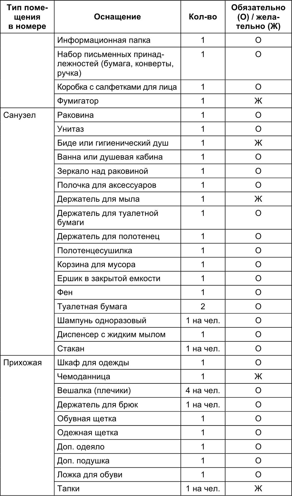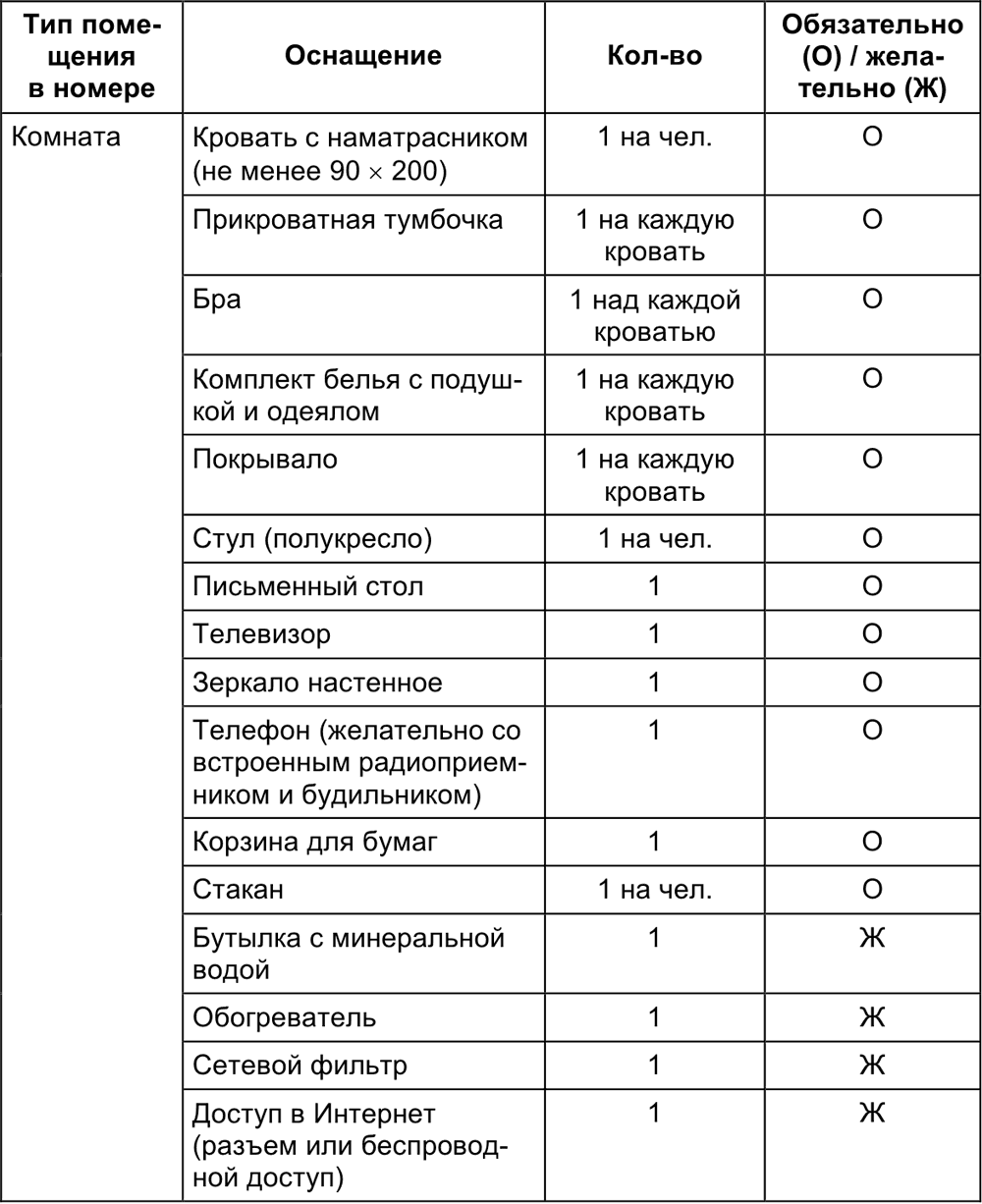 Ниже приведен пример оснащения стандартного номера отеля 3 звезды с указанием обязательности (требования нормативных актов) и желательности (традиции и требования гостей).