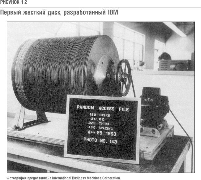 Первые жесткие диски были разработаны исследователями из лабораторий IBM в 1952–1956 гг. Названные RAMAC (аббревиатура Random Access Method for Accounting and Control), они были величиной с большой холодильник, емкостью 5 Мб и состояли из 120 24-дюймовых (60,9 см) дисков (см. рис. 1.2). Фундаментальные характеристики архитектуры и технологии компонентов, определяющие конструкцию современных жестких дисков, например пакеты жестких дисков (разработаны в 1961 г.) или дисковод для гибких дисков и архитектура Winchester (1973 г.), были также разработаны в IBM. Достижения IBM, безусловно, предопределили направление работы инженеров остальных компаний этой индустрии.