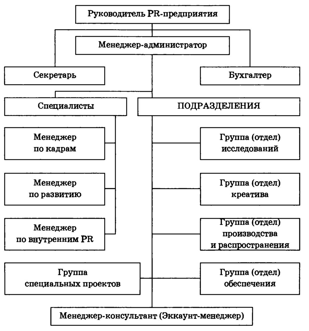 (* Заметим, что организационные структуры различных PRагентств существенно отличаются друг от друга. Например, структура PR-агентства «Международный пресс-клуб» включает три отдела – организационный, коммерческий и креативный, а также ряд вспомогательных подразделений (бухгалтерско-аудиторское, группа компьютерного обеспечения, группа консультантов, группа выпуска специзданий, информагенство). Подробнее см. Чумиков А.Н. «Связи с общественностью», М., Дело, 2001).