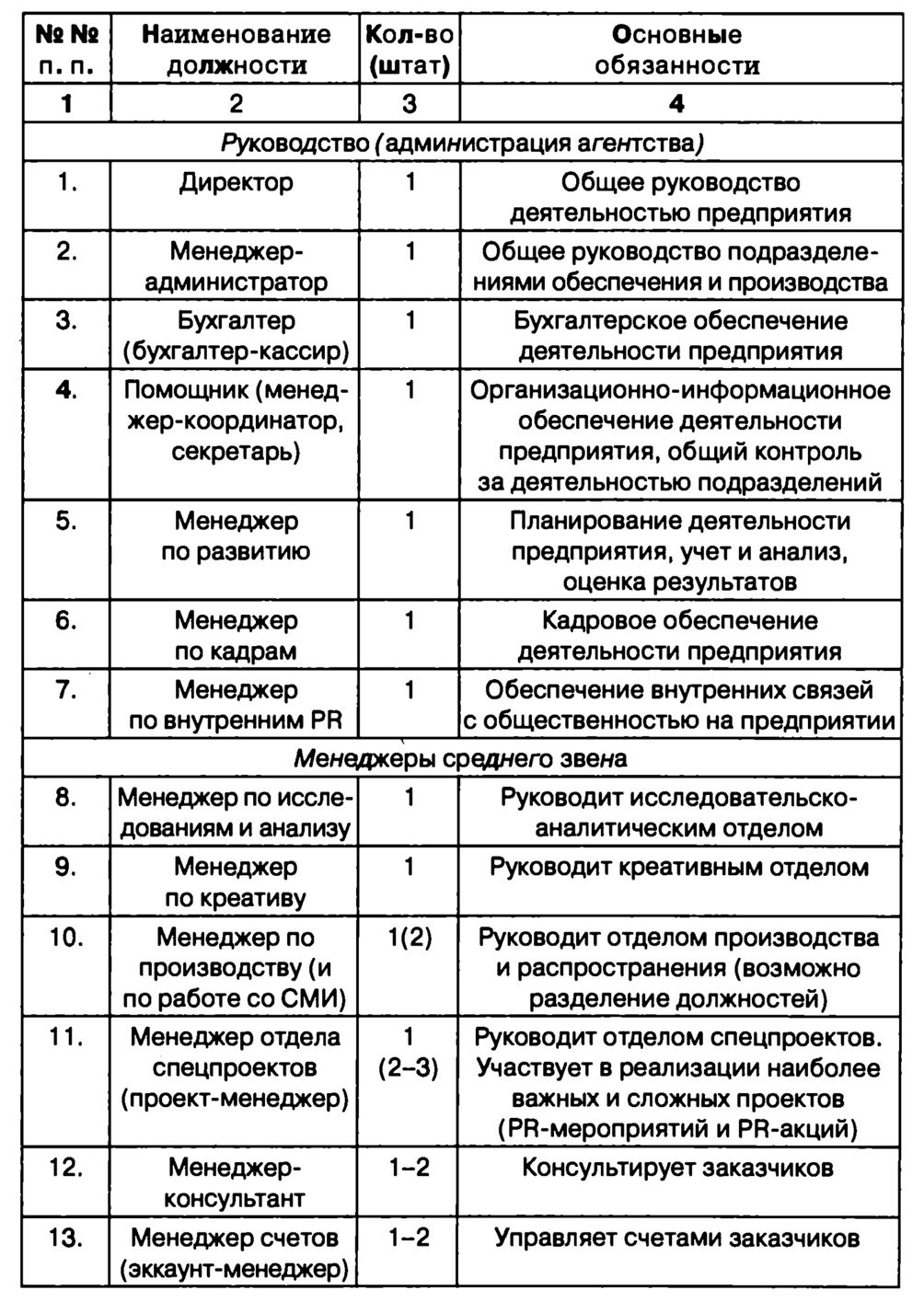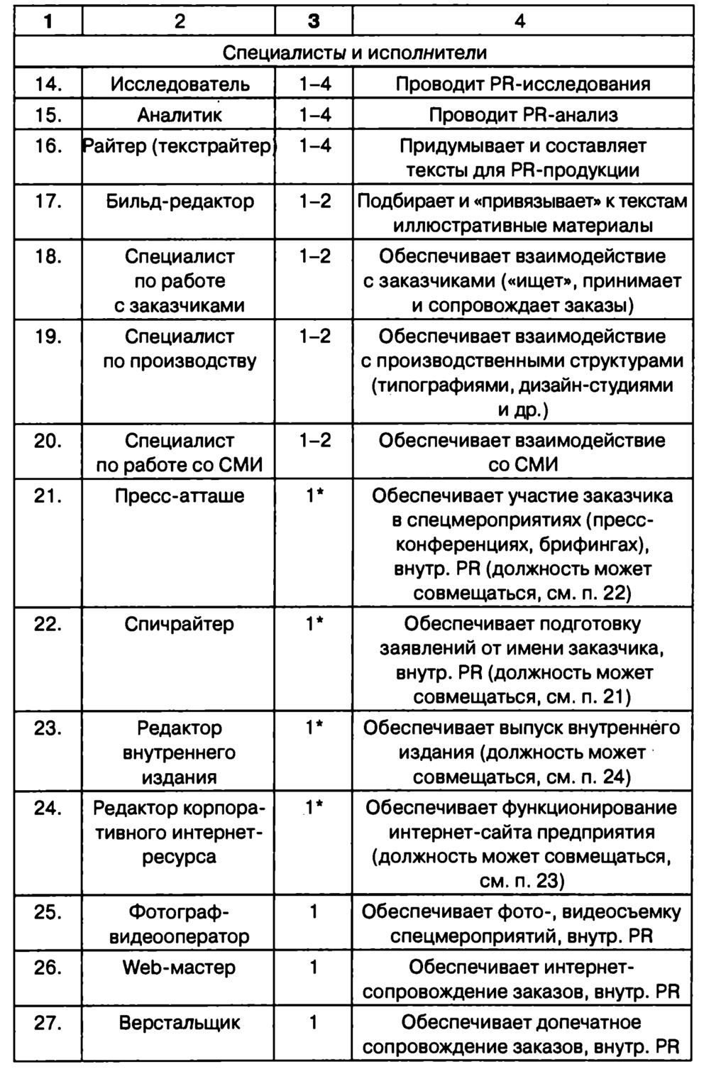 Наконец, в отдельных случаях предприятие может обратиться к услугам временных работников (фрилансеров) – как правило, PR-специалистов узкого профиля, отличающихся в то же время исключительно высокой квалификацией. Это, например, «текстовики» (текстрайтеры), фотографы, видеооператоры, специалисты по компьютерной графике, web-мастера, верстальщики, маркетологи, PR-консультанты, PR-менеджеры и т. д.* (* Фрилансеры могут поддерживать с заказчиками регулярные отношения или выполнять для них разовую работу, оставаясь «вне штата» и сотрудничая на гонорарной основе (по договору подряда)).