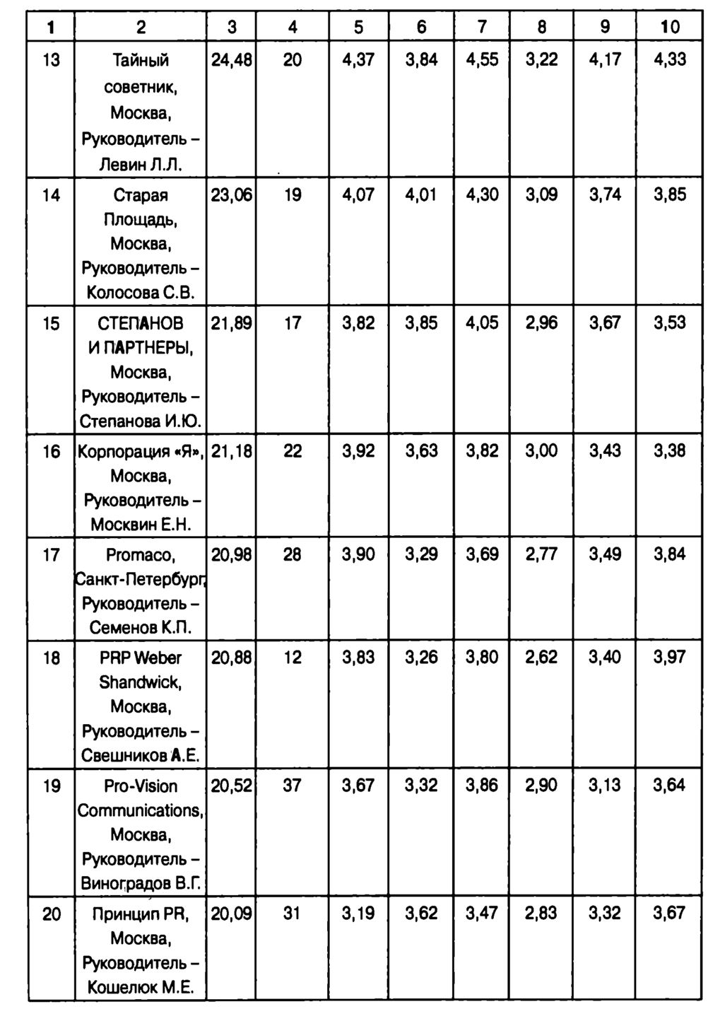 Общая характеристика состава участников профессионального PR-сообщества представлена на рис. 2.1, при этом способы их организации весьма различны (см. рис. 2.2). Первая двадцатка российских компаний по связям с общественностью представлена на рис .2.3.* (* «5-й рейтинг российских компаний по связям с общественностью *, см. www.advertology.ru). Уточним, что PR-структуры выполняют в интересах заказчиков следующие основные задачи: