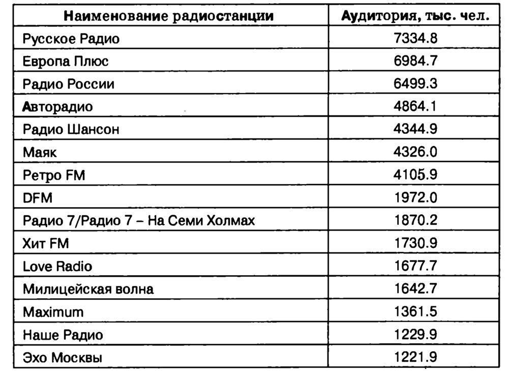 Радио остается исключительно востребованным средством информирования общественности – несмотря на популярность телевидения и ширящееся наступление компьютерных информационных технологий. Объяснение этому феномену отчасти кроется в особенностях экономического состояния российского общества – ведь радиотрансляция практически ничего не стоит рядовому жи- телю страны (копейки, которые он платит за электроэнергию, понятное дело, не в счет, а цена радиоприемника по-прежнему несопоставима с ценой телевизора или компьютера).