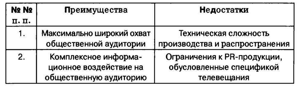 PR-продукция для телевидения должна подготавливаться к распространению с учетом того обстоятельства, что ее не только услышат, но и увидят. «Картинка» – сильный аргумент для убеждения, однако ее непрофессиональное исполнение способно оттолкнуть аудиторию от телеприемника.