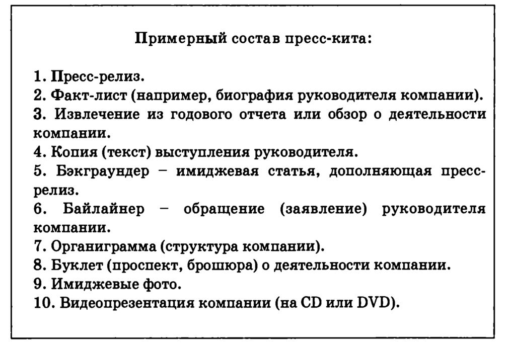 3) формирование пресс-кита (PR-комплекта, включающего все предназначенные для передачи СМИ материалы, см. рис. 3.3);