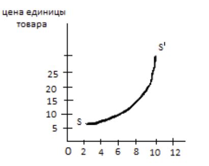 На рис. 3 представлена к р и в а я предложения, демонстрирующая закон предложения. Предложение товара имеет вид кривой с положительным наклоном, направленным вверх направо. Растет цена, растет и предложение, и наоборот. Предложение имеет неценовые детерминанты, также как и спрос. Сюда относятся: