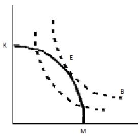Линия потребительского бюджета представлена кривой КМ. Здесь т. Е – точка равновесия в потреблении или соприкосновения с кривой безразличия В.